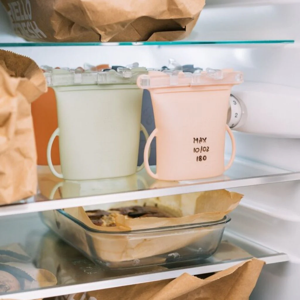 - Het zakje blijft rechtop staan, waardoor je het eenvoudig kan vullen. Dankzij de bekvormige uiteinden kan je er ook melk of soep ingieten zonder morsen.