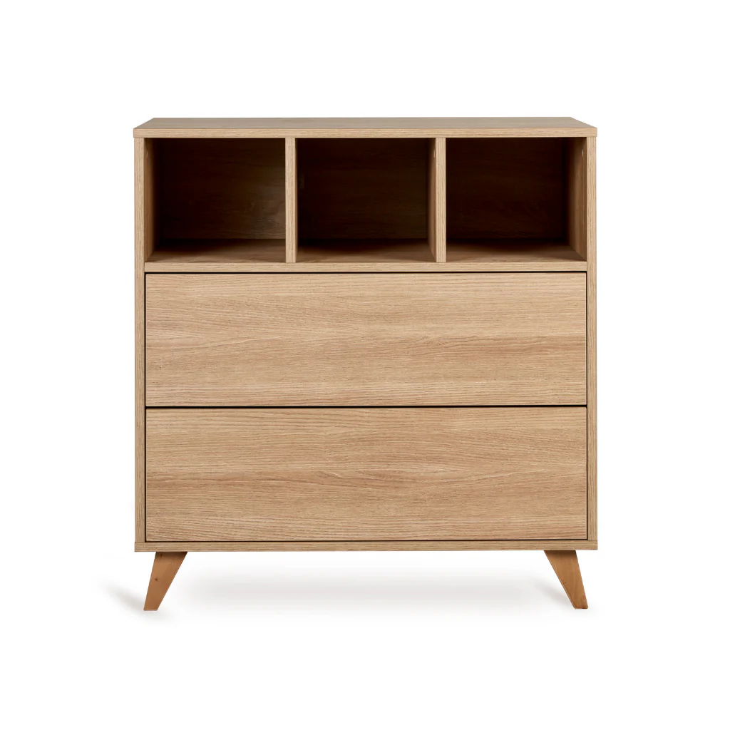 - De commode heeft 2 laden met een push-systeem. Zo kun je de commode altijd gemakkelijk en geruisloos openen.